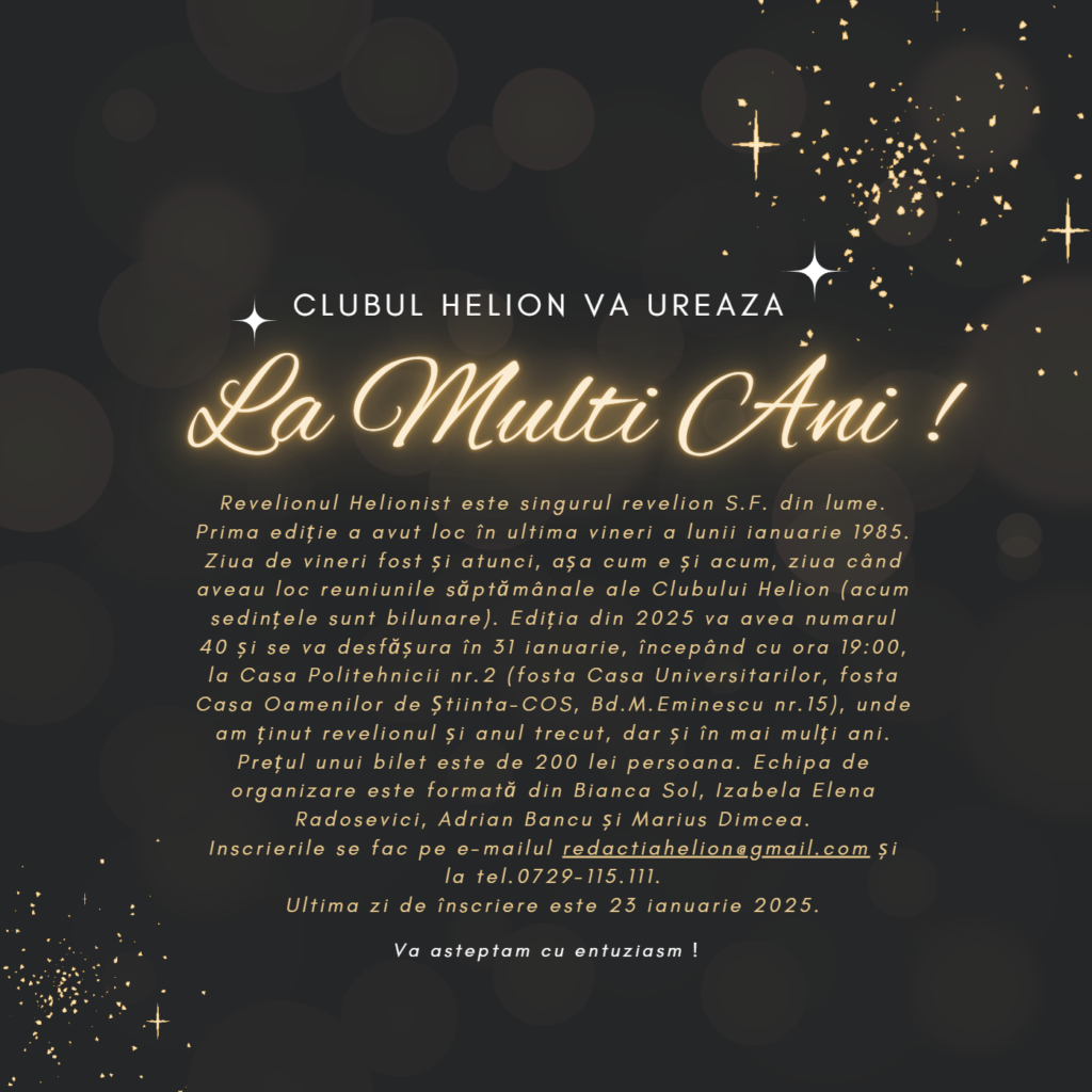 Revelionul Helionist este singurul revelion S.F. din lume. Prima ediție a avut loc în ultima vineri a lunii ianuarie 1985. Ziua de vineri a fost și atunci, așa cum e și acum, ziua când aveau loc reuniunile săptămânale ale Clubului Helion (acum sedințele sunt bilunare). Ediția din 2025 va avea numarul 40 și se va desfășura în 31 ianuarie, începând cu ora 19:00, la Casa Politehnicii nr.2 (fosta Casa Universitarilor, fosta Casa Oamenilor de Știinta-COS, Bd.M.Eminescu nr.15), unde am ținut revelionul și anul trecut, dar și în mai mulți ani.