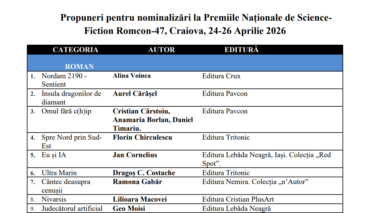 În perioada 24-26 aprilie 2026,va avea loc la Craiova a 47-a Convenție Națională de Science Fiction și Fantasy,cunoscută îndeobște sub numele de …